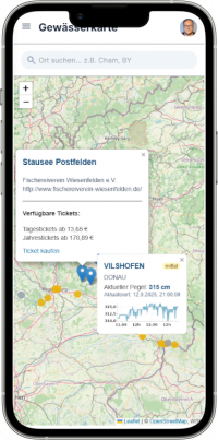 - Gewässerinformationen: Durch Klick auf einen Marker werden Details wie Gewässername, zuständiger Verein und verfügbare Ticket-Arten angezeigt.