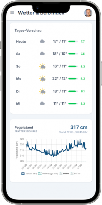 - Pegelstand-Integration: Zeigt den Pegelstand der nächstgelegenen Messstation inklusive eines Verlaufs- und Prognose-Diagramms an.